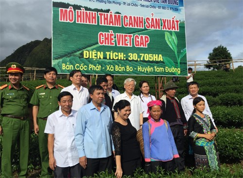 Khoảng 16 giờ, Tổng Bí thư Nguyễn Phú Trọng và Đoàn công tác Trung ương đến thăm mô hình thâm canh sản xuất chè VietGAP ở bản Cốc Phát (xã Bản Bo). Mặc dù nền đất đồi vẫn còn ẩm ướt, trơn trượt sau cơn mưa nặng hạt, nhưng Tổng Bí thư Nguyễn Phú Trọng và các đại biểu vẫn bước nhanh về phía những công nhân trong sắc phục dân tộc Thái, Lào, Giáy, Mông, Kháng... Tổng Bí thư trò chuyện rất thân mật, cởi mở, thấu hiểu niềm vui của người lao động, bởi trước khi lên tham quan đồi chè, cán bộ địa phương và lãnh đạo Công ty Đầu tư, phát triển chè Tam Đường đã giới thiệu cụ thể với Tổng Bí thư về hiệu quả của cây chè trồng theo mô hình VietGAP và tình hình thu nhập của công nhân. Chị Mé Thị Xe, công nhân hái chè cho biết, bình quân mỗi người hái chè có thu nhập hằng tháng khoảng 3-5 triệu đồng (tùy theo kết quả lao động). Đây là mức thu nhập khá cao so với lao động phổ thông địa phương. Hơn nữa, đất canh tác chè vốn là đất sản xuất của các hộ dân bản địa, nay cho công ty thuê trồng chè nên người dân còn có thêm một khoản thu nhập khá lớn và ổn định.