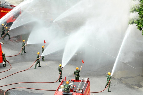 Lực lượng phòng cháy, chữa cháy Lữ đoàn 144, Bộ Tổng Tham mưu luyện tập chữa cháy. Ảnh: MINH TRƯỜNG |