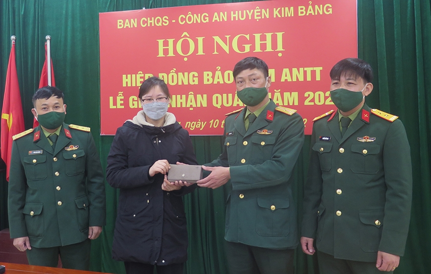 | Thiếu tá QNCN Trần Đức Hậu, nhân viên bảo mật, Ban CHQS huyện Kim Bảng (Bộ CHQS tỉnh Hà Nam) cùng chỉ huy đơn vị trao trả lại tài sản cho chị Lê HươngThơm. |