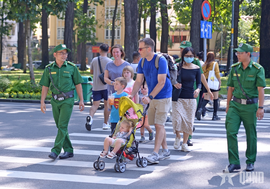 | Trật tự viên TNXP TP Hồ Chí Minh hỗ trợ khách du lịch quốc tế. |