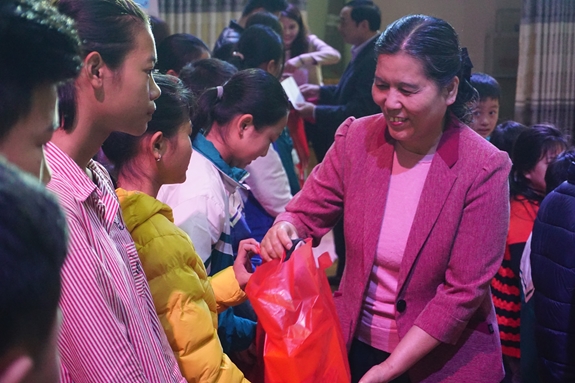 Bà Nguyễn Thị Thanh Hòa, Chủ tịch Hội Bảo vệ quyền trẻ em Việt Nam trao quà Tết cho trẻ em có hoàn cảnh khó khăn tỉnh Thanh Hóa.