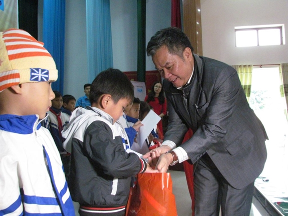 Ông Lương Thế Khanh, Trưởng Ban Vận động chính sách, Tổ chức và Truyền thông trao quà cho trẻ em có hoàn cảnh khó khăn tại huyện Tân Kỳ, tỉnh Nghệ An. |