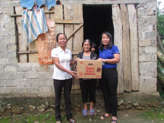 | Chị Trương Thị Hường (bên trái) trao quà của Chi hội Phụ nữ xóm Kẻo hỗ trợ hội viên phụ nữ khó khăn. |