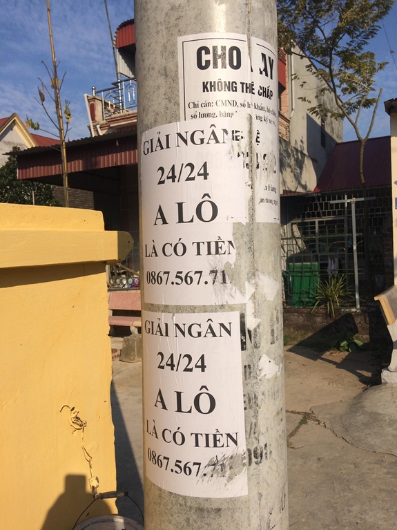 Thực hiện Chỉ thị số 12/CT-TTg ngày 25-4-2019 của Thủ tướng Chính phủ về tăng cường phòng ngừa, đấu tranh với tội phạm và vi phạm pháp luật liên quan đến hoạt động “tín dụng đen”, Bộ Công an cùng các địa phương đều quyết liệt ra quân dẹp tệ nạn này. Thế nhưng khi đến công tác tại thị xã Sơn Tây (Hà Nội), chúng tôi vô cùng ngạc nhiên vì thấy quảng cáo “tín dụng đen” dán khắp nơi, từ cổng trường, những bức tường, cột điện ngay mặt phố tới các xóm, ngõ…