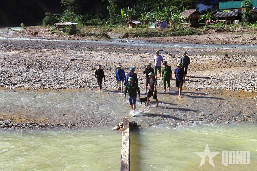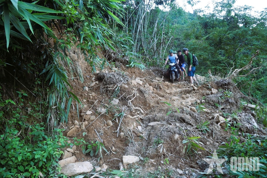 Sau mưa lũ, con đường độc đạo men theo núi rừng vào bản làng nằm tách biệt giữa rừng có hàng chục điểm sạt lở nghiêm trọng. Bước đầu, tổ công tác cố gắng để di chuyển xe máy qua các vị trí đất, đá đổ xuống, với mong muốn cơ động nhanh hơn, rút ngắn thời gian vào bản, nhưng sau đó, mọi người quyết định để lại phương tiện, đi bộ cắt rừng, đi qua những điểm sạt lở nguy hiểm.
