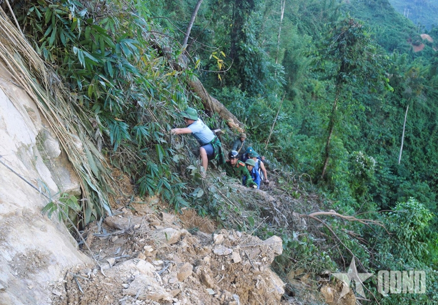 Các lực lượng vượt rừng, vách đá cheo leo để tới bản bị chia cắt.