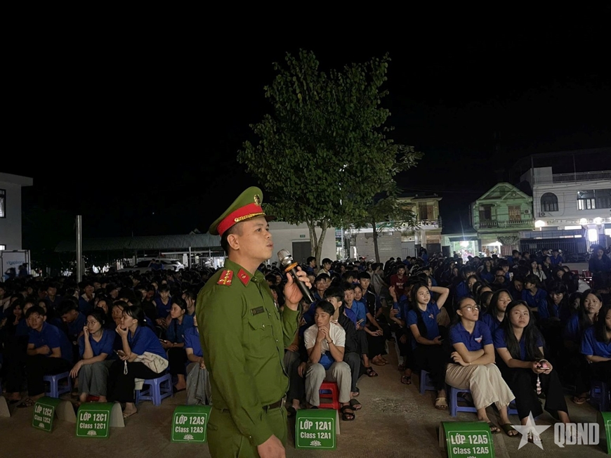 Cán bộ công an xã Mường Xén tuyên truyền để học sinh tích cực tham gia chuyển đổi số và phòng, chống tội phạm trên không gian mạng.