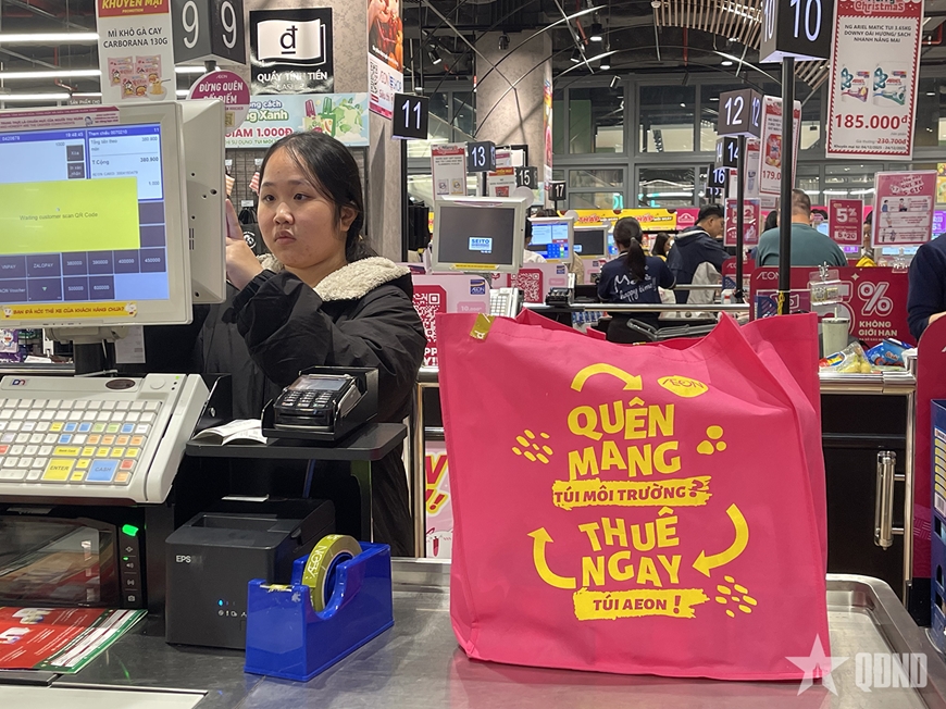 Bên cạnh MM Mega Market, AEON Việt Nam cũng là một trong những đơn vị thể hiện những nỗ lực to lớn trong việc thay đổi thói quen của người tiêu dùng. Ngoài việc thay thế hoàn toàn túi nilon bằng túi phân hủy sinh học, hệ thống này còn bày bán các loại túi tái chế với đủ kích thước, phát triển dịch vụ thuê túi môi trường “Rent a bag” tại các quầy thanh toán. Khách hàng chỉ cần trả 5.000 đồng cho mỗi chiếc túi và sẽ được hoàn tiền khi trả lại vào lần mua sắm tiếp theo. Theo thông tin từ Phòng Truyền thông và Đối ngoại AEON, từ năm 2022 đến tháng 5-2025, dịch vụ này đã ghi nhận gần 66.000 túi vải được thuê.