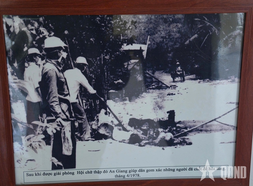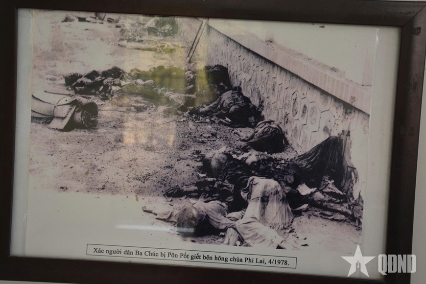 | Nhà lưu niệm - nơi bảo tồn các hình ảnh, vết máu, vật dụng của người dân Ba Chúc - bằng chứng sống động về tội ác của Khmer Đỏ. |