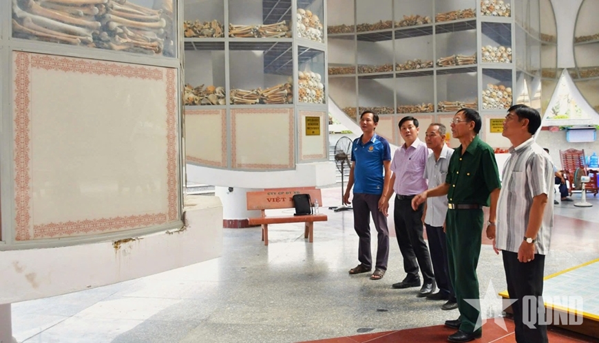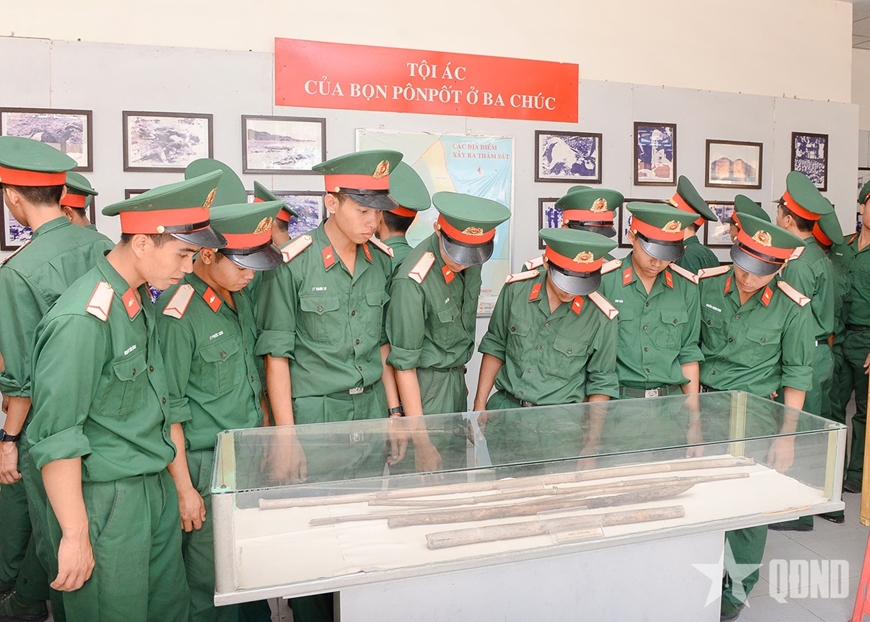 | Cán bộ, chiến sĩ Lữ đoàn Tăng thiết giáp 416, Quân khu 9 tham quan, tìm hiểu lịch sử Nhà mồ Ba Chúc. |