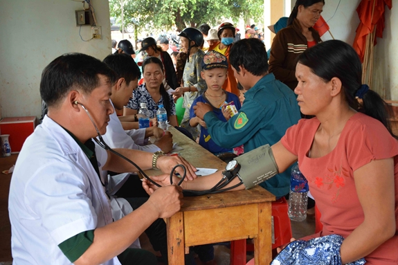 Các thầy thuốc Bộ đội Biên phòng tỉnh Gia Lai khám bệnh, cấp thuốc cho bà con địa phương. |
