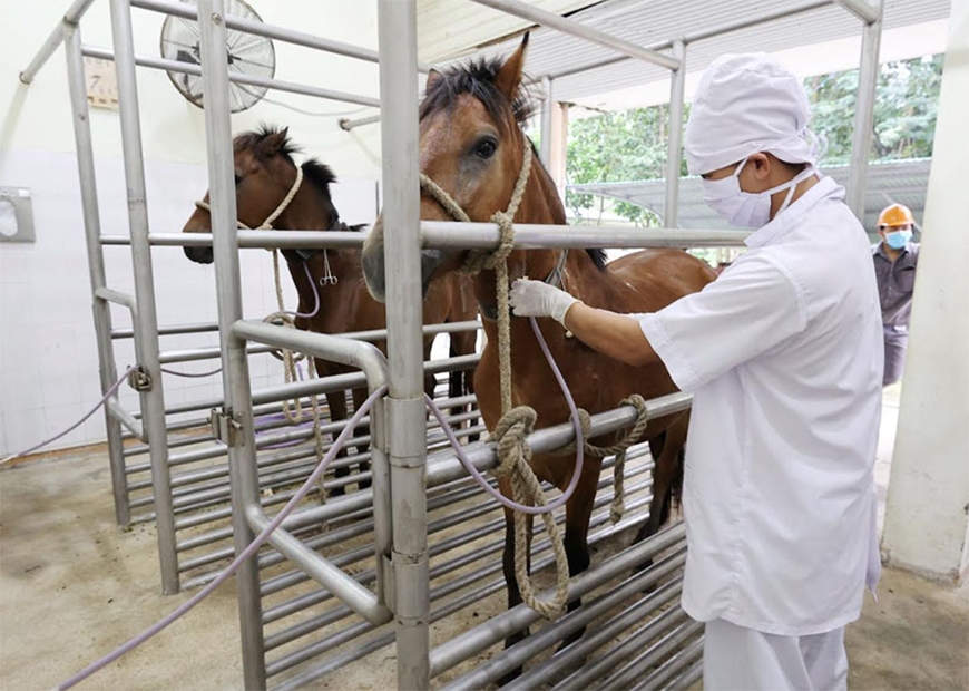 Không dừng lại ở chăm sóc thường nhật, đội ngũ bác sĩ thú y và cán bộ kỹ thuật còn trực tiếp theo dõi sức khỏe từng chú ngựa. Thực hiện quy trình gây miễn dịch khoa học, chính xác và nhân đạo, bảo đảm ngựa đạt trạng thái sinh lý tốt nhất trước khi lấy máu. Mỗi lần gây miễn dịch, mỗi lần lấy máu là sự kết hợp nhuần nhuyễn giữa chuyên môn, kinh nghiệm và tinh thần trách nhiệm, với mục tiêu cao nhất là thu được những giọt máu chất lượng, đồng thời bảo đảm phúc lợi và an toàn cho đàn ngựa.
