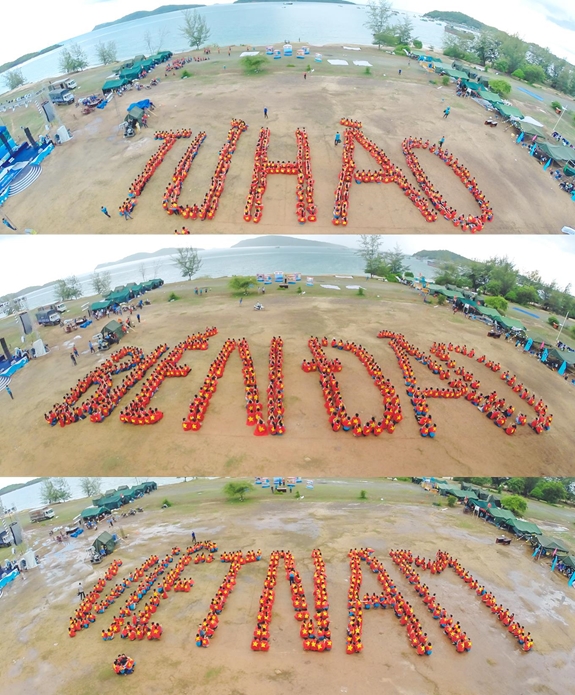 Đại biểu tham gia Chương trình “Sinh viên với biển, đảo” xếp chữ tại đảo Cô Tô.
