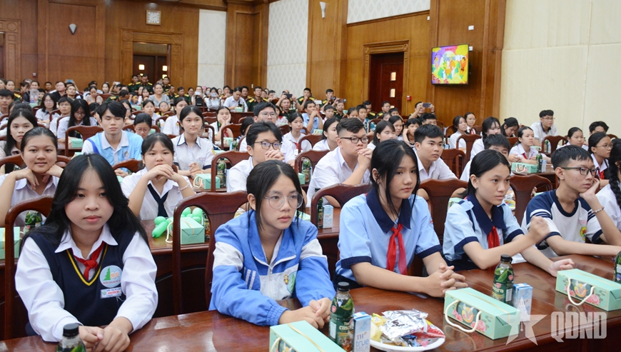 Các em thiếu niên, nhi đồng có thành tích xuất sắc dự tuyên dương tại Bộ tư lệnh Quân khu 7. |