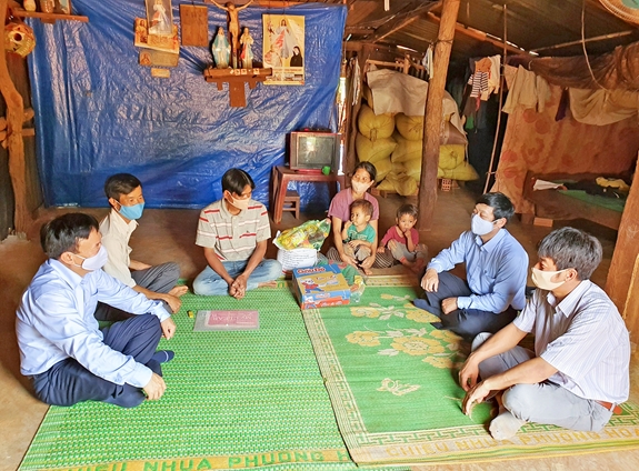 Cán bộ PC Gia Lai và địa phương bàn bạc, thống nhất vị trí xây nhà cho gia đình anh KPă Rung, ở làng Tung Blai, xã Ia Dreng, huyện Chư Pưh. |