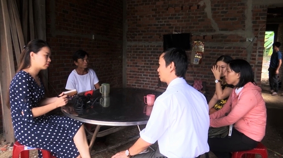 Ông Nguyễn Văn Bài (áo may ô trắng, bên trái nhìn sang) tiếp phóng viên trong căn nhà đang xây dựng từ nguồn hỗ trợ cho gia đình chính sách từ Trung ương. |