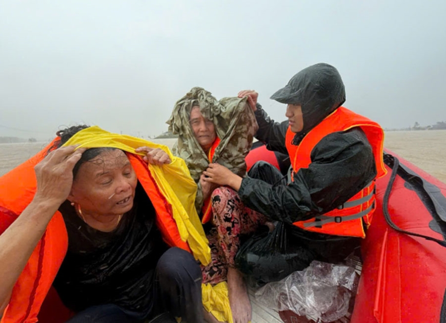 | Lực lượng cứu hộ, cứu nạn của Quân khu 5 đưa người dân ở "rốn lũ" Hòa Thịnh (Đắk Lắk) đi sơ tán. |