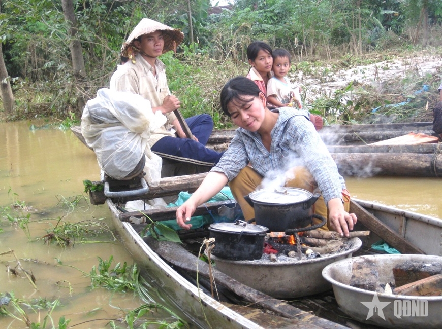 Bếp “dã chiến” chỉ có 3 viên gạch được người dân kê trong chiếc thau nhôm, bên trong rải một lớp tro khô. Bếp gọn nhẹ, kín gió, sử dụng rất tiện lợi, tiết kiệm củi; khi cần có thể di chuyển khắp nơi. Thực tế cho thấy, những chiếc bếp “dã chiến” đã trở thành vật dụng giúp hàng nghìn người dân “đỏ lửa” mỗi khi nhà cửa ngập sâu trong lũ...
