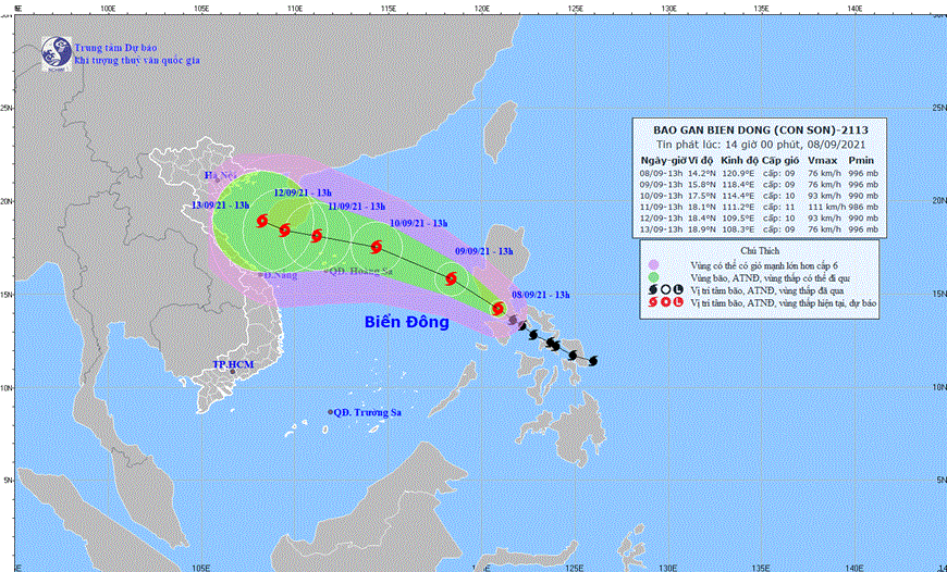 Sức gió mạnh nhất vùng gần tâm bão mạnh cấp 9 (75-90km/giờ), giật cấp 11. Dự báo trong 24 giờ tới, bão Conson di chuyển theo hướng Tây Bắc, mỗi giờ đi được 10-15km, đi vào Biển Đông. Đến 13 giờ ngày 9-9, vị trí tâm bão ở khoảng 15,8 độ Vĩ Bắc; 118,4 độ Kinh Đông, cách quần đảo Hoàng Sa khoảng 660km về phía Đông Đông Nam. Sức gió mạnh nhất vùng gần tâm bão mạnh cấp 9 (75-90km/giờ), giật cấp 11.