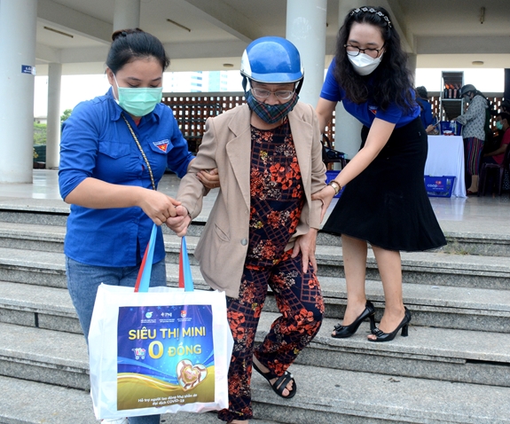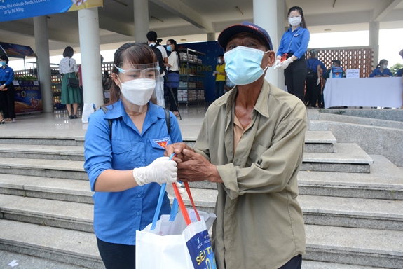 Lực lượng đoàn viên, thanh niên giúp đỡ bà Lê Thị Bắc Hải (trú tại tổ 46, phường Hòa Thuận Tây, quận Hải Châu) sau khi mua hàng.