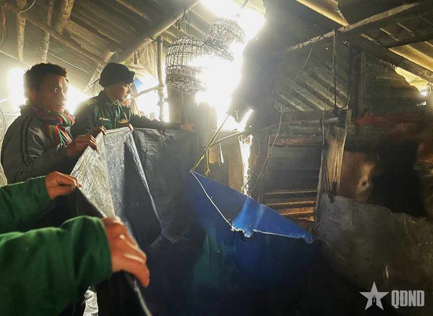 Cùng với tuyên truyền, cán bộ, chiến sĩ trực tiếp hỗ trợ bà con gia cố chuồng, chằng chống mái, kéo bạt che gió. Chỗ nền ẩm được hướng dẫn lót rơm khô; hộ thiếu thức ăn được nhắc tăng cường dự trữ rơm cỏ, băm thân ngô khô.