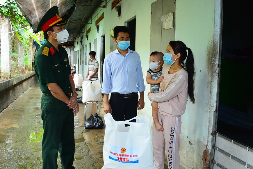 | Ông Lê Ngọc Ninh (giữa) cùng đoàn công tác Bộ CHQS tỉnh Bình Dương thăm, tặng quà công nhân hoàn cảnh khó khăn tại thị xã Tân Uyên. |