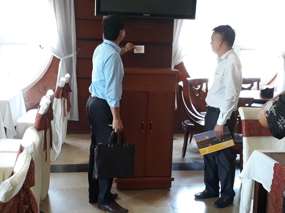 Đoàn kiểm tra liên ngành kiểm tra việc treo, dán biển báo cấm hút thuốc tại các nhà hàng khách sạn trên địa bàn. |