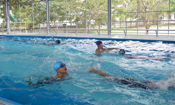 Các em học sinh tập bơi trong bể bơi phòng, chống đuối nước tại Trường Tiểu học Ngô Quyền (quận Cẩm Lệ, TP Đà Nẵng). |