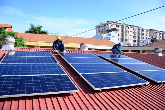 Công nhân lắp đặt hệ thống điện mặt trời áp mái trong khu vực dân cư tại TP Hồ Chí Minh.