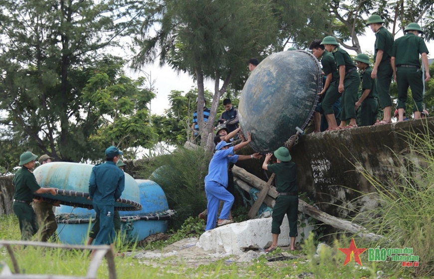 | Bộ đội Biên phòng TP Đà Nẵng cùng lực lượng dân quân, tự vệ phường Thọ Quang, TP Đà Nẵng hỗ trợ người dân đưa thuyền thúng lên bờ tránh bão. Ảnh: NGUYỄN ĐÔNG |