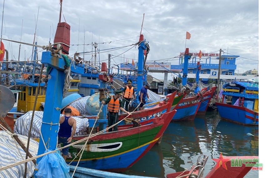 | Cán bộ Đồn Biên phòng Cửa khẩu cảng Sa Kỳ, Bộ đội Biên phòng tỉnh Quảng Ngãi hỗ trợ ngư dân phòng tránh bão Noru. Ảnh: VIÊN NGUYỄN |