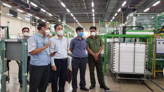 Tại Công ty Samsung - SEHC. Ông Đỗ Thành Hải, Giám đốc An toàn Sức khỏe Môi trường, Công ty Samsung - SEHC cho biết, công ty có 7.000 người lao động, 16 phân xưởng. Tại công ty đã phát hiện 46 ca mắc Covid-19, 300 F1. Những ca bệnh và F1, F2 phát hiện tại 3 phân xưởng. Ở 3 phân xưởng này đều đã tạm thời ngưng hoạt động. Với sự trao đổi của đoàn kiểm tra, công ty sẽ có những điều chỉnh trong công tác tiếp nhận và xử trí đối với người lao động có triệu chứng nghi ngờ mắc Covid-19, và các phương án phòng, chống dịch bệnh, khử khuẩn phân xưởng. Đặc biệt, công ty đang xây dựng phương án tổ chức cách ly người lao động ngay tại doanh nghiệp để đảm bảo an toàn sản xuất.