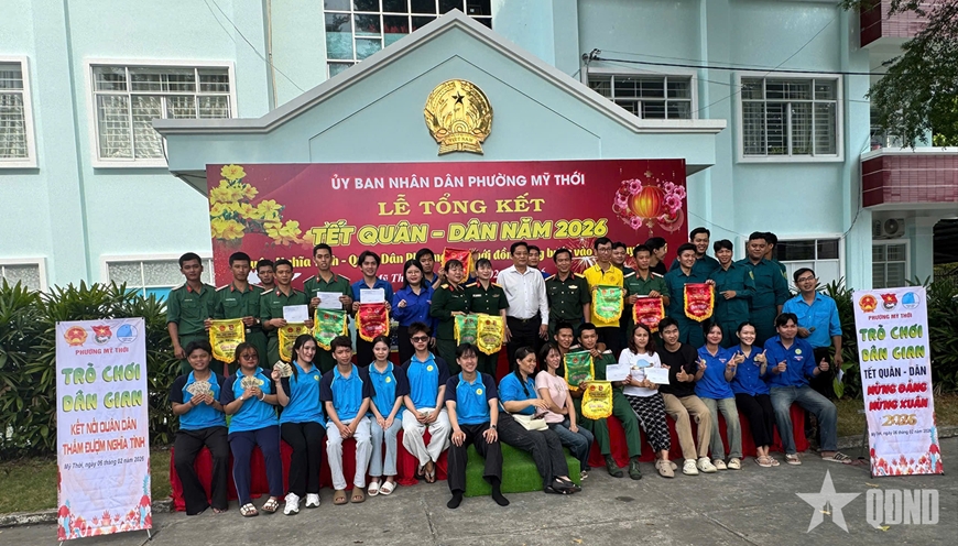 | Lãnh đạo phường Mỹ Thới cùng cán bộ, chiến sĩ và đoàn viên, thanh niên chụp ảnh lưu niệm tại Lễ tổng kết Tết Quân - dân năm 2026. |