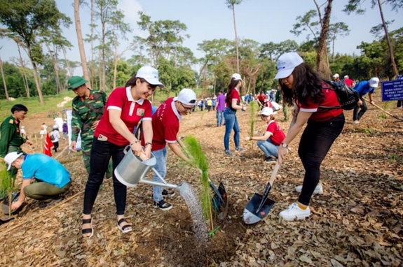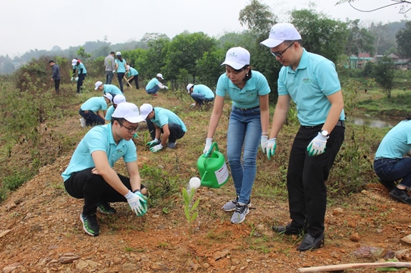 Đoàn viên Agribank tham gia trồng cây phủ xanh đất trống đồi trọc. |