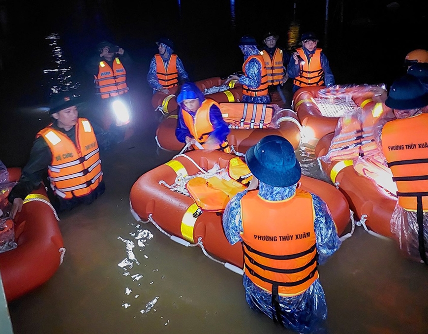 Không chỉ ở Bệnh viện Trung ương Huế, công tác cứu hộ, di dời người dân ở các vùng trọng điểm ngập lụt cũng được cán bộ, chiến sĩ LLVT TP Huế tiến hành xuyên đêm. Giữa màn mưa trắng xóa, không quản ngại đêm tối, đường cơ động khó khăn, bộ đội, dân quân khẩn trương rà soát từng khu vực ngập lụt, tiếp cận từng gia đình với quyết tâm không để ai bị mắc kẹt trong lũ lớn. Đồng chí Trần Ngọc Hảo, Chỉ huy trưởng Ban CHQS phường An Cựu, thông tin: Hầu hết gia đình cán bộ, chiến sĩ dân quân trên địa bàn phường đều bị thiệt hại do mưa lũ, nhưng tất cả đều cố gắng bám địa bàn thực hiện nhiệm vụ, nỗ lực hỗ trợ, giúp đỡ người dân kịp thời, hiệu quả.