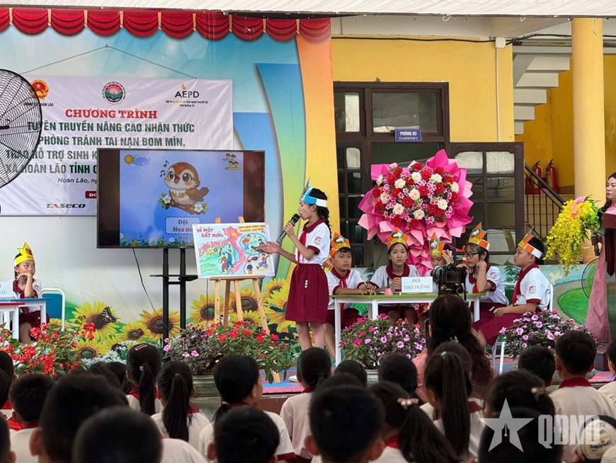 | Học sinh Trường Tiểu học Hòa Trạch tham gia chương trình tuyên truyền phòng tránh tai nạn bom mìn. Ảnh: NGỌC MINH |