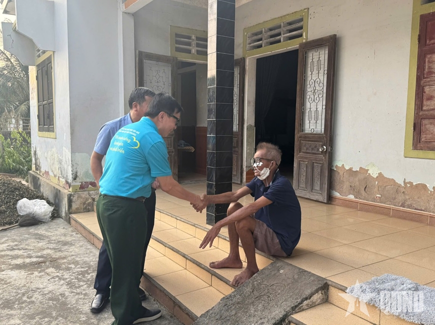 | Đoàn công tác thăm hỏi sức khỏe ông Võ Văn Khảng. Ảnh: NGỌC MINH |