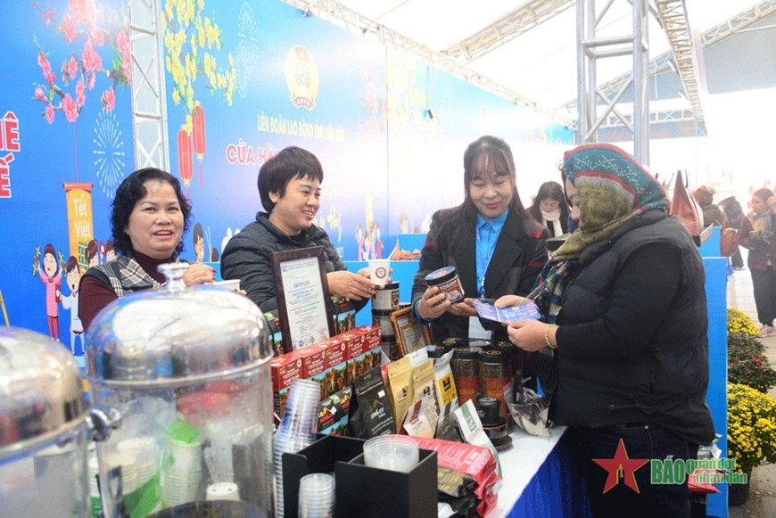 | Đoàn viên công đoàn mua sắm tại các gian hàng trong khuôn khổ chương trình Chợ Tết Công đoàn “Tết sum vầy - Xuân ơn Đảng” do Liên đoàn Lao động tỉnh Điện Biên tổ chức năm 2025. Ảnh: HÀ KHÁNH |