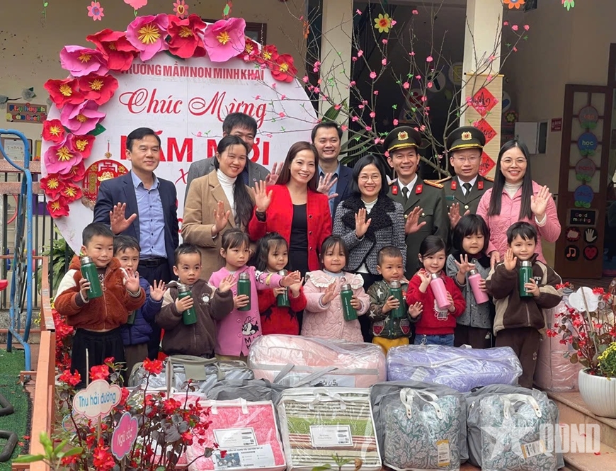 | Lãnh đạo Quỹ Bảo trợ trẻ em Việt Nam và đại diện Công ty Cổ phần Everpia tặng quà cho học sinh Trường Mầm non Minh Khai nhân dịp Tết Nguyên đán Bính Ngọ. |