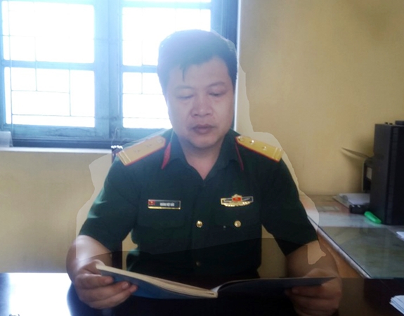 Trung tá Hoàng Việt Đức, Chính trị viên phó Ban CHQS huyện Cao Phong bên cuốn nhật ký của cha. |