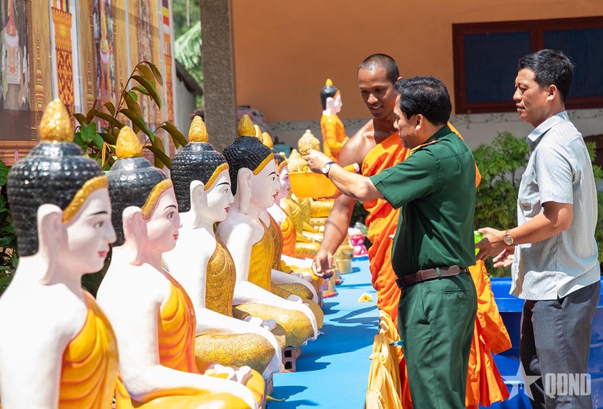 Đồng chí Phó chính ủy Bộ CHQS tỉnh ghi nhận và đánh giá cao vai trò của các vị chức sắc, sư sãi trong việc tuyên truyền, vận động phật tử, đồng bào Khmer chấp hành tốt chủ trương của Đảng, chính sách, pháp luật của Nhà nước; tích cực tham gia xây dựng khối đại đoàn kết toàn dân tộc, giữ vững an ninh chính trị, trật tự an toàn xã hội trên địa bàn.