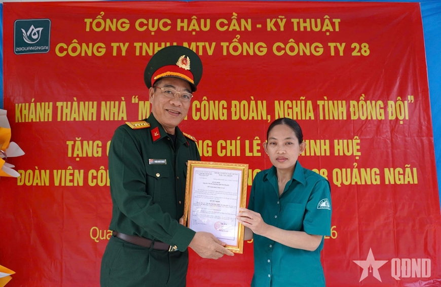 Ngày 24-1, tại thôn 9 (xã An Phú, tỉnh Quảng Ngãi), Tổng công ty 28 (Tổng cục Hậu cần - Kỹ thuật) tổ chức khánh thành, bàn giao nhà “Mái ấm công đoàn, nghĩa tình đồng đội” năm 2025 cho đoàn viên công đoàn Lê Thị Minh Huệ, Công nhân Tổ may 1 (Công ty Cổ phần 28 Quảng Ngãi).