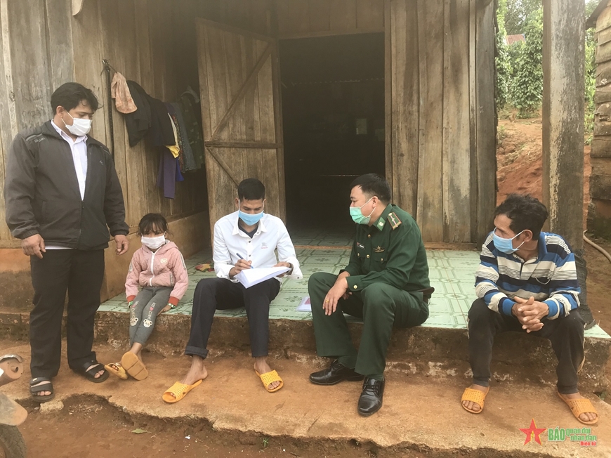 | Cán bộ Đồn Biên phòng Đăk Dang (Bộ đội Biên phòng tỉnh Đắc Nông) phối hợp tuyên truyền phòng, chống dịch Covid-19 cho người dân xã Quảng Trực, huyện Tuy Đức, tháng 10-2021. Ảnh: HỒNG THẮM. |