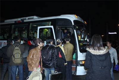 Lao động Việt Nam từ Li-bi về đến sân bay Nội Bài đang lên xe buýt để về đoàn tụ cùng gia đình.