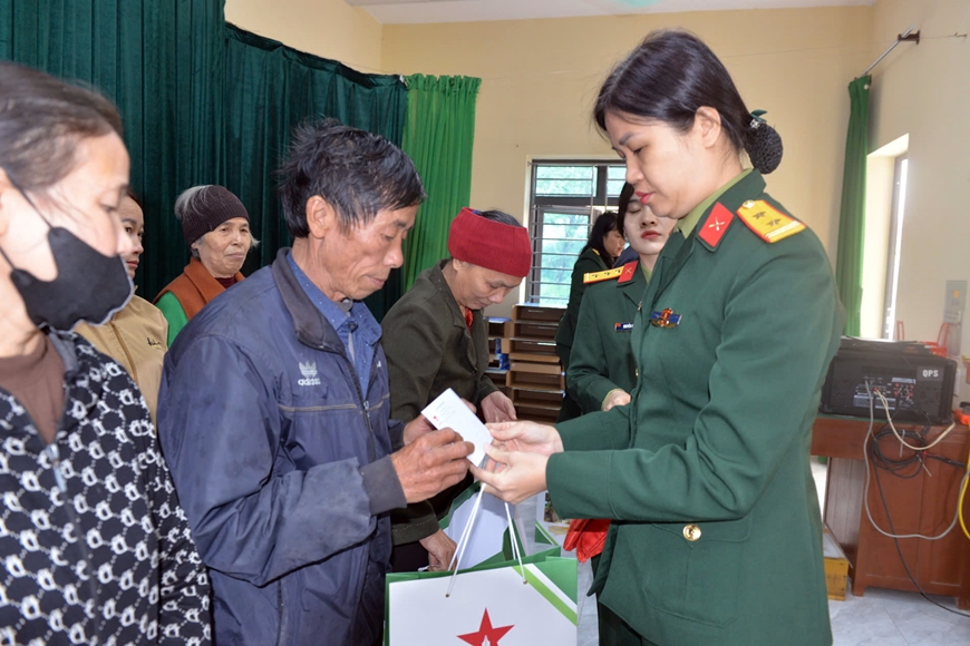 | Trung tá Lê Thanh Tuyền, Chủ tịch Hội Phụ nữ Báo Quân đội nhân dân trao quà tặng bà con phường Kim Bảng, tỉnh Ninh Bình. |