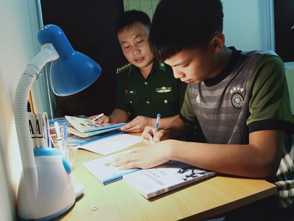Đại úy Lò Văn Toàn hướng dẫn cháu Vi Việt Khang học tập.
