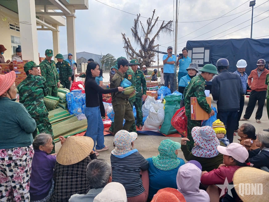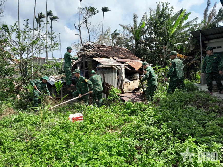 Đồn Biên phòng Nhơn Lý cử 12 cán bộ, chiến sĩ giúp bà Hồ Thị Lan, 90 tuổi, sống 1 mình tại thôn Mỹ Trung, xã Tuy Phước Đông dọn dẹp vệ sinh, chặt tỉa cây ngã đổ, sửa chữa lại nhà cửa, khắc phục hậu quả bão số 13 và đợt ngập lụt xảy ra vừa qua.