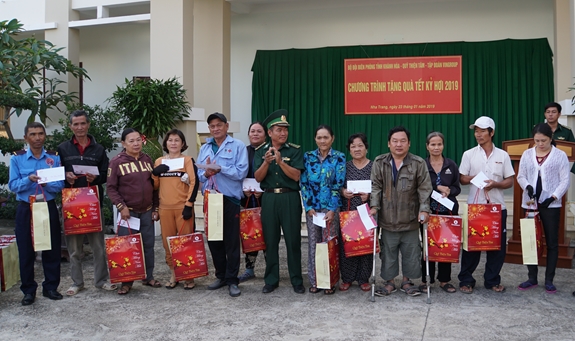 Trong hai ngày 22 và 23-1, Bộ chỉ huy Bộ đội Biên phòng (BĐBP) tỉnh Khánh Hòa và các nhà tài trợ đã trao tặng 310 suất quà (mỗi suất 500.000 đồng) tặng đồng bào nghèo xã đảo Vạn Thạnh, huyện Vạn Ninh và phường Vĩnh Hòa, TP Nha Trang, tỉnh Khánh Hòa chuẩn bị vui Xuân, đón Tết Kỷ Hợi 2019.