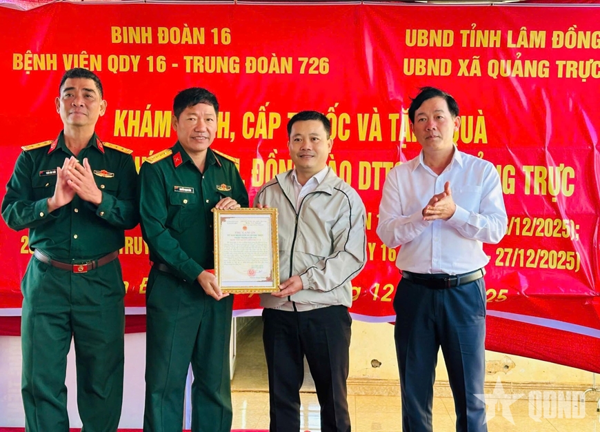 Đồng chí Nguyễn Trung Thành, Phó chủ tịch UBND xã Quảng Trực, tỉnh Lâm Đồng trao thư cảm ơn Bệnh viện Quân dân y 16.