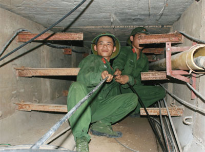 Chiến sĩ Lữ đoàn thông tin 205 hạ ngầm cáp quang trên địa bàn Hà Nội